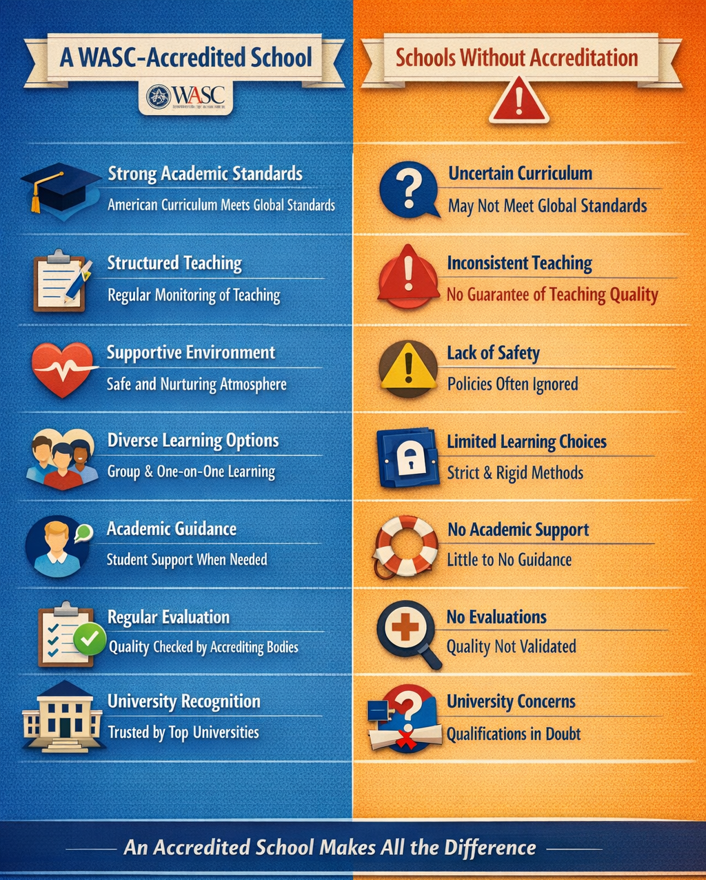 获得WASC认证的学校以其高标准的教育质量而闻名。因此,当你选择一所获得WASC认证的学校,比如国际学校时,你会感到安心,因为这意味着这所学校已经过审核和批准。对吧?