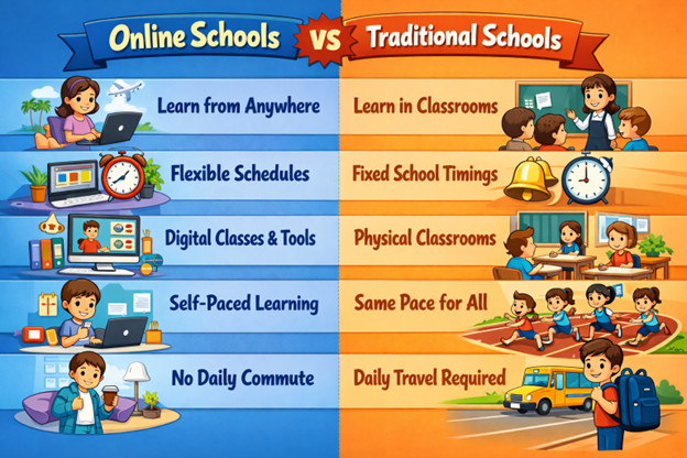 在线学校是一种数字化或虚拟学校,只要能连接到互联网,您的孩子就可以随时随地学习。